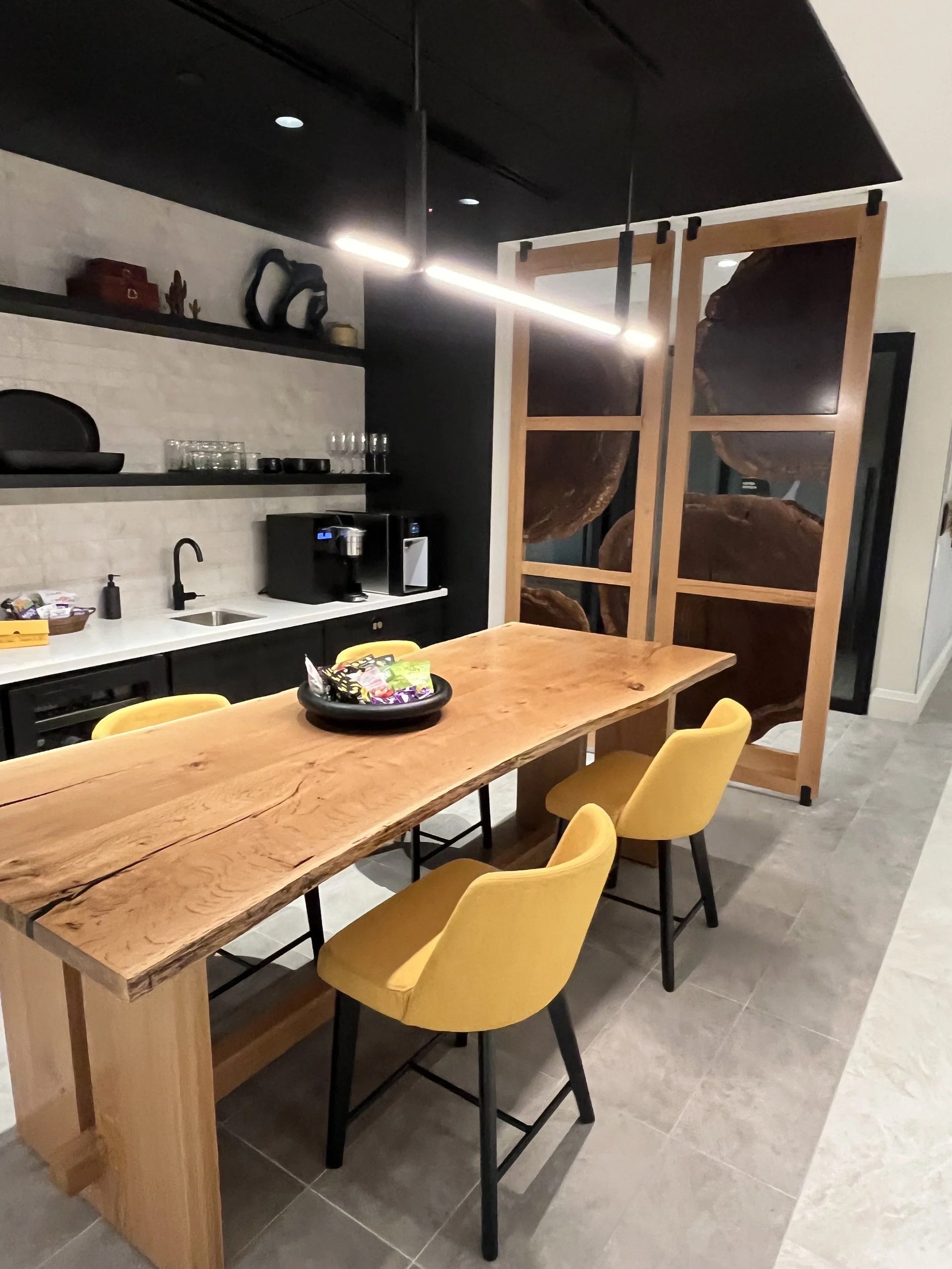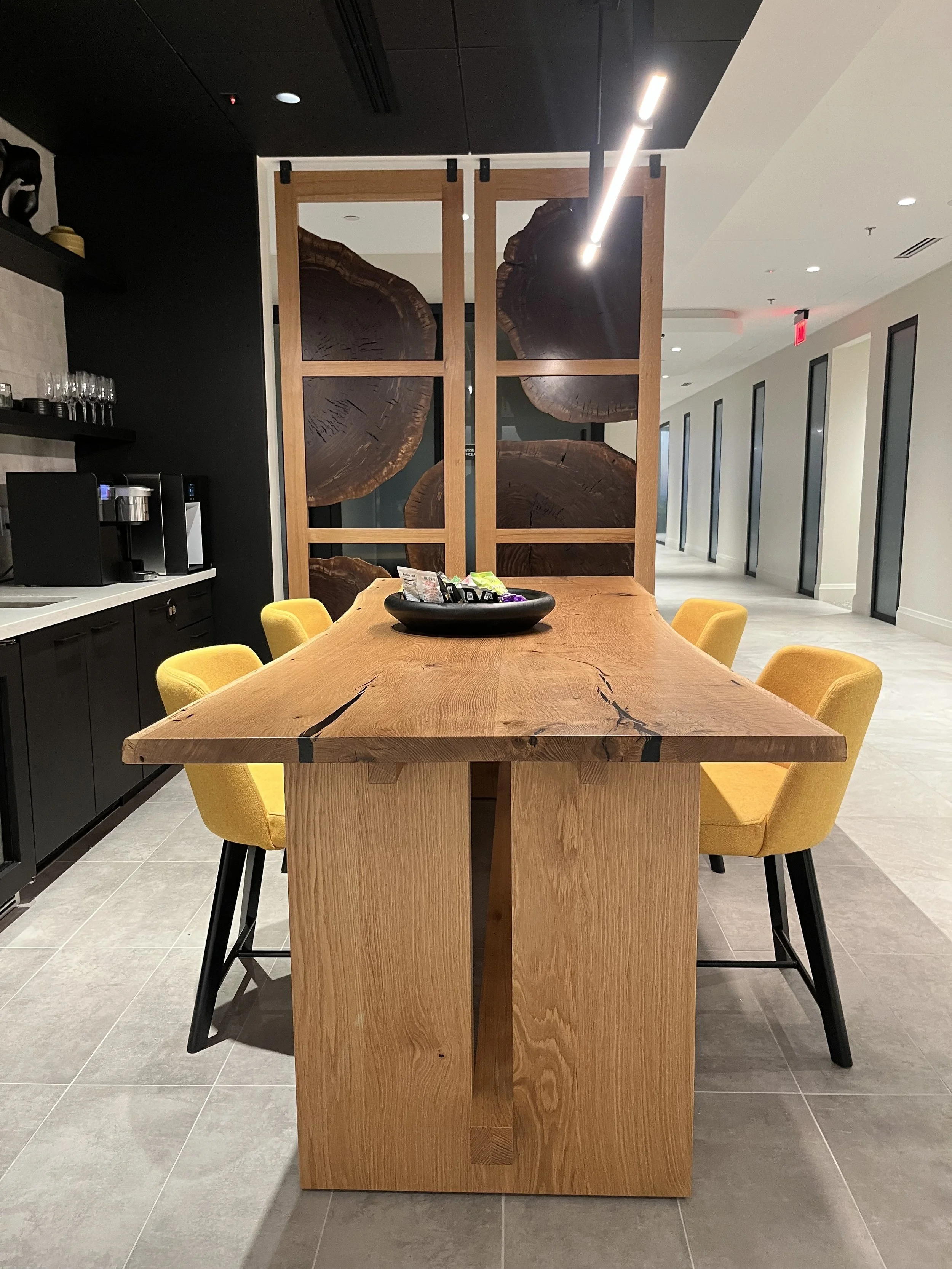 The combination of White oak and Walnut used in an otherwise black and white interior adds a cohesive visual between “departure” objects within a space. Without the synergy between the table and room divider, individually they read as an afterthought. Together they create a space intentionally different from work stations.