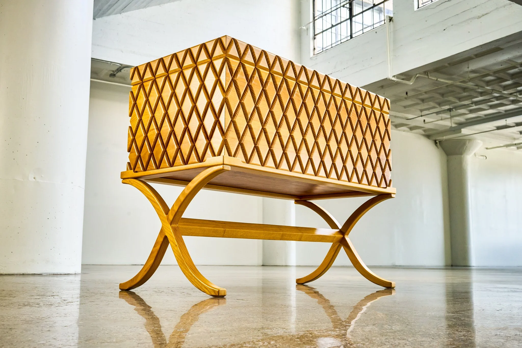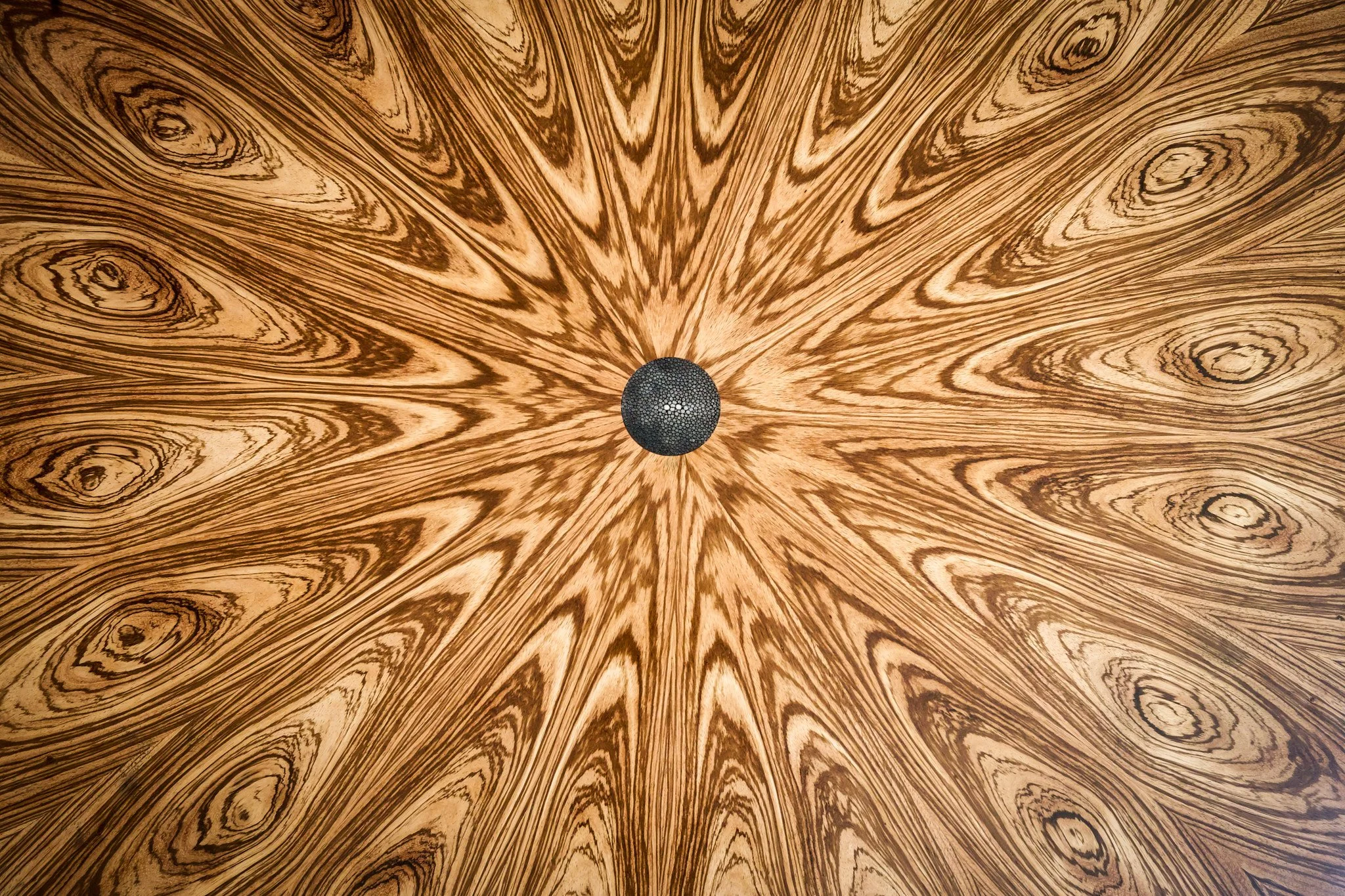 For our Smithsonian presentation, it was important that the work reflect the full breadth of our craft, spanning from exotic veneer and inlay to ultra-local solid wood. The Fairfax table pairs Cameroon zebrawood with New Zealand shagreen inlay, anchored by a 20-sided sunburst match. In contrast, the Mississippi Steam Trunk is made from local Osage orange, a species seldom used in furniture because of its irregular growth and small diameter. Also known as bowwood for its historic use by the Osage Nation in longbows, its dense, thorned growth habit is said to have inspired barbed wire.